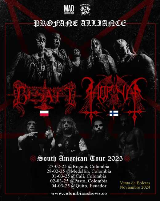 en por confirmar🔥 Profane Alliance Tour - 2025: HORNA & BESATT en Colombia 🔥La aclamada gira Profane Alliance Tour llegará a Colombia en marzo de 2025, trayendo a las legendarias bandas de black metal Horna y Besatt. No te pierdas esta experiencia única en las siguientes ciudades:MedellÃnBogotáCaliPastoQuito, Ecuador🔸 Preventa: A partir de noviembre de 2024.Para más información y compra de entradas, visita www.colombianshows.co