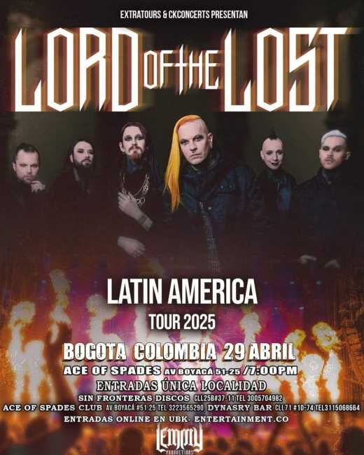en ACE OF SPADES CLUBPor primera vez en Colombia LORD OF THE LOST, la Banda Alemana procedente de Hamburgo. La Banda creada por Cris "The Lord" Harms en 2007 que en sus principios fue influenciada por el metal gótico, hoy ya cuenta con 8 álbumes de estudio en los que mezcla de manera magistral los sonidos industriales melódicos, el glam y las influencias metalcore. Sus dos últimos discos "Judas" y "Blood ando Glitter" han sido aclamados por el público, el primero por ser un disco conceptual doble que cuenta la historia de Judas Iscariote mostrando desde varias perspectivas a este personaje bíblico. Y por recurrir a instrumentos más clásicos cómo son el piano, órgano y coros. Y el segundo por alejarse completamente al disco anterior, volviendo a sus influencias de bandas glam de los 80 y 70, pero con pinceladas propias de una banda del siglo XXI.La cita será el martes 29 de abril en el Ace of Spades de la ciudad de Bogotá.Boletería: $140.000 + servicio