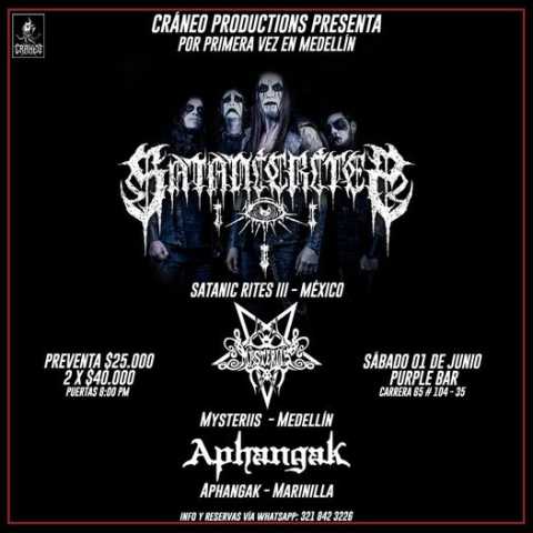 en Purple BarDesde México Satanic Rites III Mex Sábado 01 de Junio - Purple barCarrera 65 # 104 - 35 Castilla - MedellínBoleteria Disponible Preventa: $25,0002 X $40,000WhatsApp: 321 8423226Junto a ellosMysteriisAphangak Banda#blackmetal