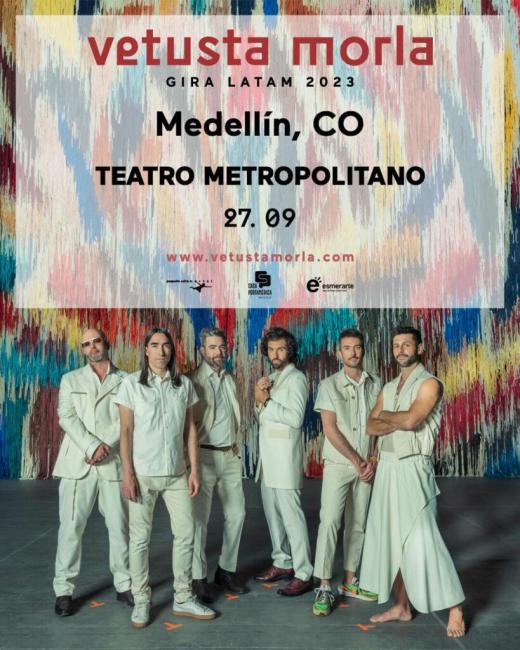 en Teatro Metropolitano¡Medellín! vetustamorla está de vuelta. Después de un apoteósico show en 2022, los españoles regresan a Colombia. Con más canciones y emociones en una noche que promete quedarse en nuestro corazón. Comprar PLATEA VIPPrecio: $215.000+ Servicio de $39.000Aforo 331 PLATEA ESPECIALPrecio: $175.000+ Servicio de $26.000Aforo 214 PLATEAPrecio: $145.000+ Servicio de $24.000Aforo 214 BALCONPrecio: $127.000+ Servicio de $20.000Aforo 322